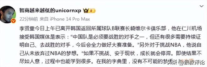另外对于挑战NBA,他说自己从未放弃过NBA的梦想。“如果不挑战、安于现状,成长就会停滞。即使结果不尽如人意,过程中也能学到很多。在我的字典里,没有不可能的梦想。